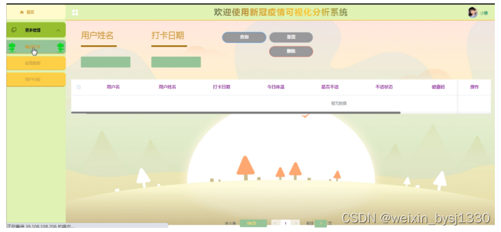 用户登录进入新冠疫情可视化分析系统 可以查看后台首页、个人中心、更多管理(每日打卡、疫情数据、用户行程)等信息,如图5-9所示。