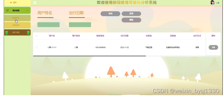 用户行程,在用户行程页面中可以查看用户名、用户姓名、联系电话、出行日期、出发地、目的地、出行方式等信息,还可以根据需要进行修改或删除等操作,如图5-11所示。