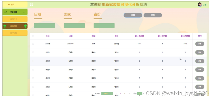 疫情数据,在疫情数据页面中可以查看年份、日期、国家、省份累计确诊数、累计死亡数、累计治愈数等信息,还可以根据需要进行修改或删除等操作,如图5-12所示。