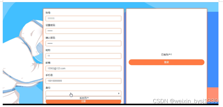 用户注册,在用户注册页面可以填写账号、密码、昵称、邮箱、手机号码、身份、性别、身份证号码等详细内容进行注册,如图5-8所示。