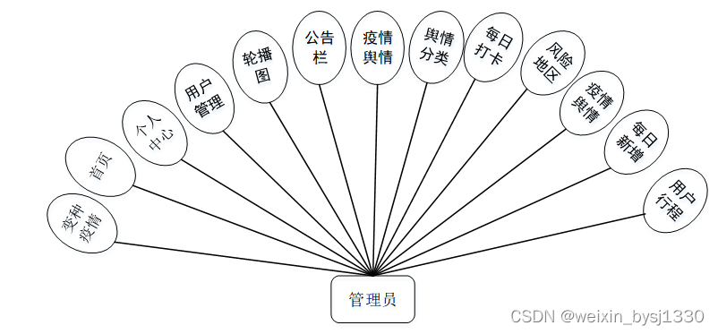 (1)管理员模块:系统中的核心用户是系统管理员,管理员登录后,通过管理员菜单来管理后台系统。主要功能有:首页、站点管理(轮播图、公告栏)、用户管理(管理员、系统用户)、内容管理(疫情舆情、舆情分类)、更多管理(每日打卡、风险地区、疫情数据、每日新增、用户行程、变种疫情)等功能。管理员用例图如图3-1所示。