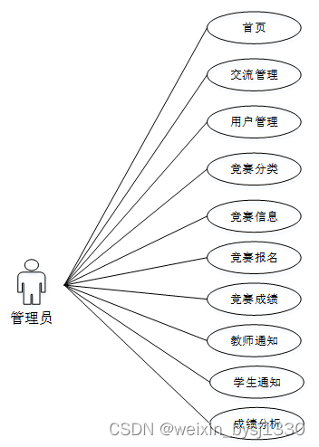 系统中的核心用户是系统管理员,管理员登录后,通过管理员菜单来管理后台系统。主要功能有:首页、轮播图、网站公告、资源管理(竞赛资讯、资讯分类)交流管理(竞赛交流、交流分类)系统用户(管理员、教师用户、学生用户)模块管理(竞赛分类、竞赛信息、竞赛报名、竞赛成绩、教师通知、学生通知、成绩分析)等功能。管理员用例如图3-7所示。
