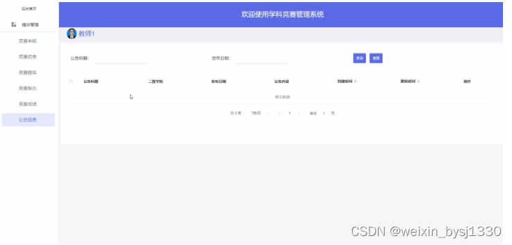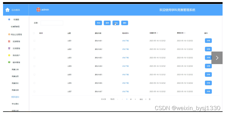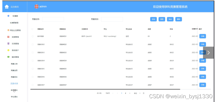 管理员登录进入学科竞赛管理系统可以查看首页、轮播图、网站公告、资源管理(竞赛资讯、资讯分类)交流管理(竞赛交流、交流分类)系统用户(管理员、教师用户、学生用户)模块管理(竞赛分类、竞赛信息、竞赛报名、竞赛成绩、教师通知、学生通知、成绩分析)等信息,如图5-7所示。