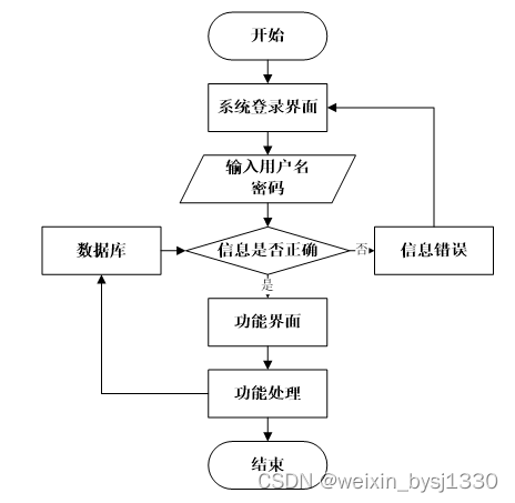 用户打开并进入系统后,会先显示登录界面,输入正确的用户名和密码,系统自动检测信息,若信息无误,则用户会进入系统功能界面,进行操作,否则会提示错误无法登录,操作流程如图3-3所示。