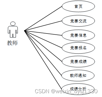 教师进入系统可以进行首页、交流管理(竞赛交流)模块管理(竞赛信息、竞赛报名、竞赛成绩、教师通知、成绩分析)等。教师用例如图3-9所示。
