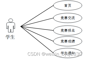 学生进入系统可以进行首页、竞赛交流、竞赛报名、竞赛成绩、学生通知等。学生用例如图3-8所示。