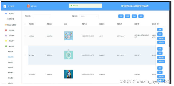 管理员对竞赛信息进行管控,可对竞赛信息进行增删改查、成绩分析、竞赛报名等信息操作,如图5-8所示。