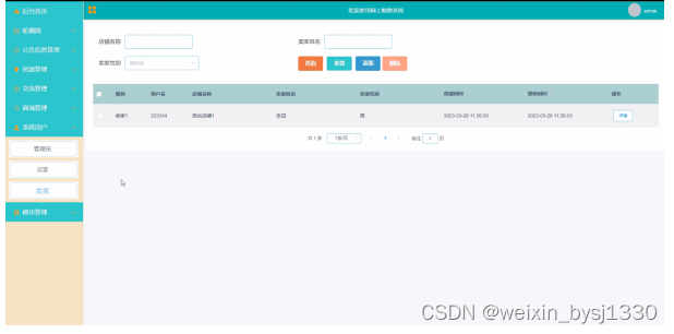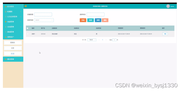 该功能包括对卖家进行添加、删除、修改,审核卖家注册、删除普通卖家、修改普通卖家的个人资料。首先管理员卖家进入后台主页,在左边菜单栏选择相应的功能操作。