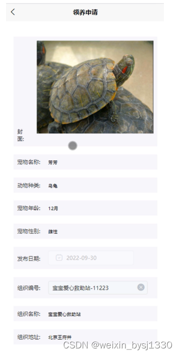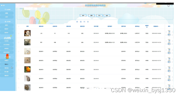 领养中心管理,在领养中心管理页面查看封面、宠物名称、宠物种类、宠物年龄、宠物性别、发布日期、组织编号、组织名称、组织地址等信息,如图5-12所示。