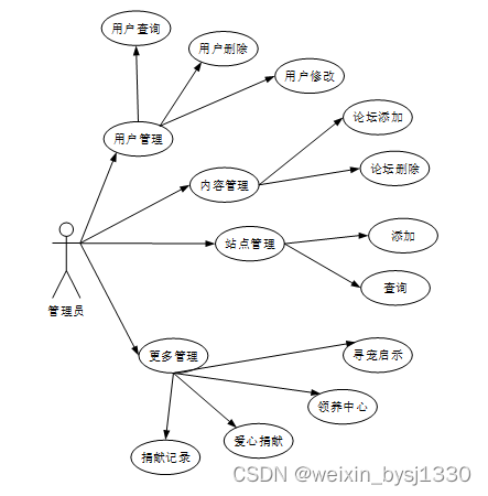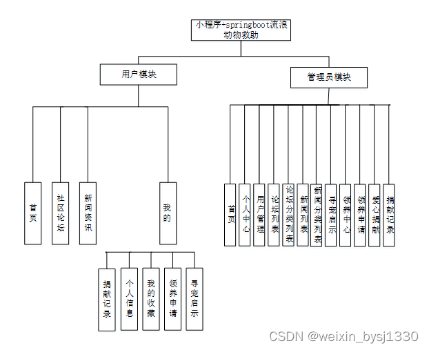 基于流浪动物救助系统的设计基于现有的手机,可以实现管理员:首页、站点管理(轮播图、公告栏)用户管理(管理员、测试用户、组织用户)内容管理(论坛列表、论坛分类列表、新闻列表、新闻分类列表)更多管理(寻宠启示、领养中心、领养申请、爱心捐献、捐献记录)等详细的了解及统计分析。根据系统功能需求建立的模块关系图如下图: