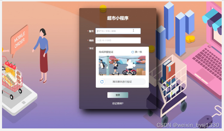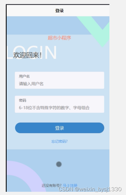 超市小程序登录界面,通过填写账号、密码、登录用户类型等信息进行登录,如图5-1所示。