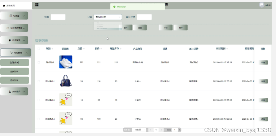 在管理员功能页面可以查看首页、轮播图、公告信息、资源管理(商品资讯、资讯分类)商城管理(在线商城、分类列表、订单列表)系统用户(管理员、普通用户)系统管理等内容进行相对应操作,如图5-8所示。