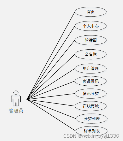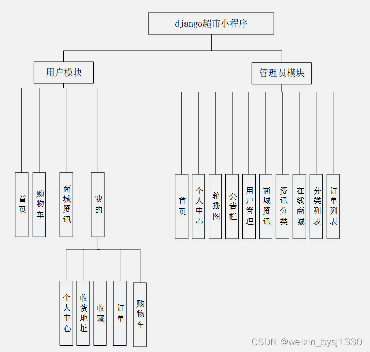 基于超市小程序的设计基于现有的手机,可以实现首页、轮播图、公告信息、资源管理(商品资讯、资讯分类)商城管理(在线商城、分类列表、订单列表)系统用户(管理员、普通用户)等详细的了解及统计分析。根据系统功能需求建立的模块关系图如下图: