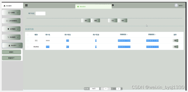用户管理,在用户管理页面可以查看用户名、昵称、性别、年龄、用户编号等内容,并可根据需要进行修改或删除操作,如图5-9所示。