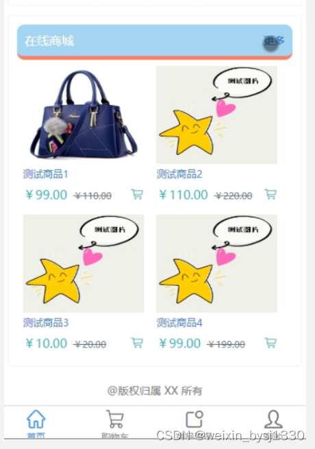 在线商城,在线商城页面可以商品名称、商品价格、商品图片、商品描述等信息,并可根据需要加入购物车、收藏或购买。如图5-5所示。