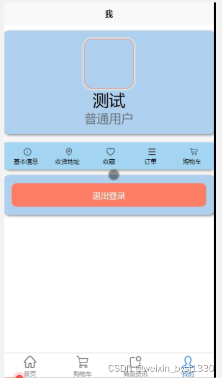 我的,在我的页面可以查看个人信息、收货地址、收藏、订单、购物车等详细信息,如图5-6所示。