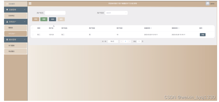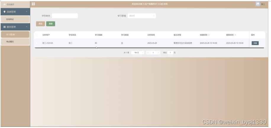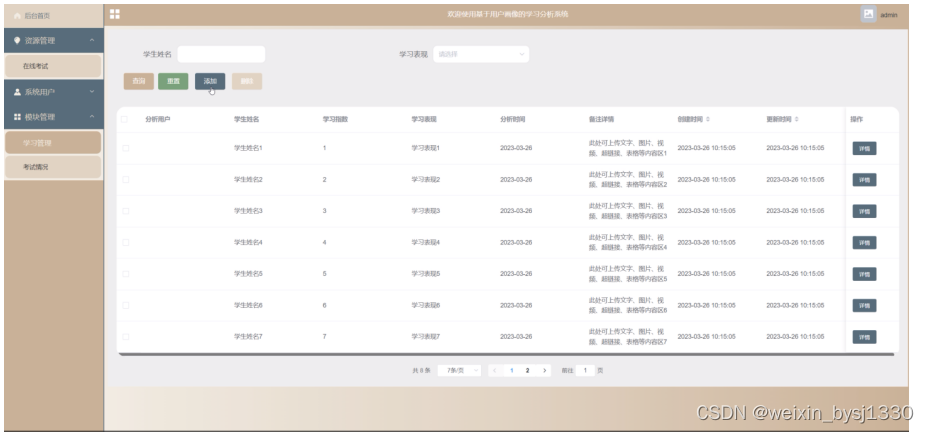 学习管理,在此页面可以查看索引、分析用户、学生姓名、学习指数、学习表现、分析时间、备注详情等信息,管理员可根据需要进行重置,删除,添加等操作,如图5-3所示。