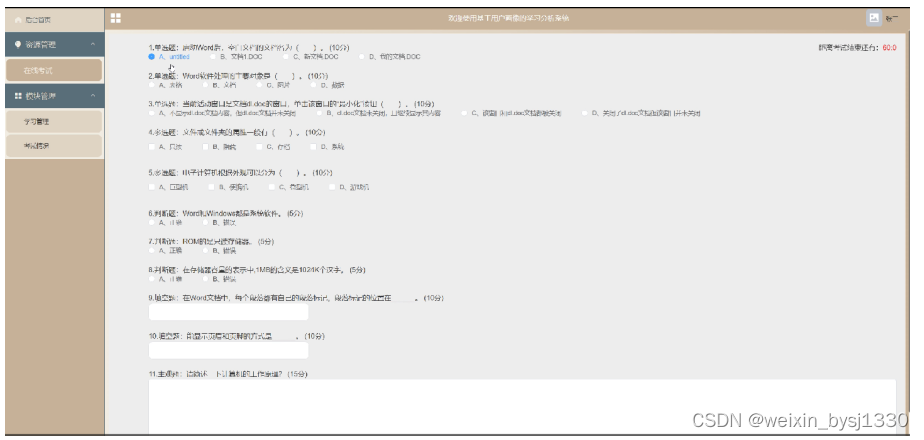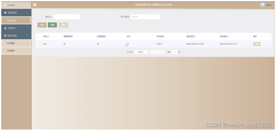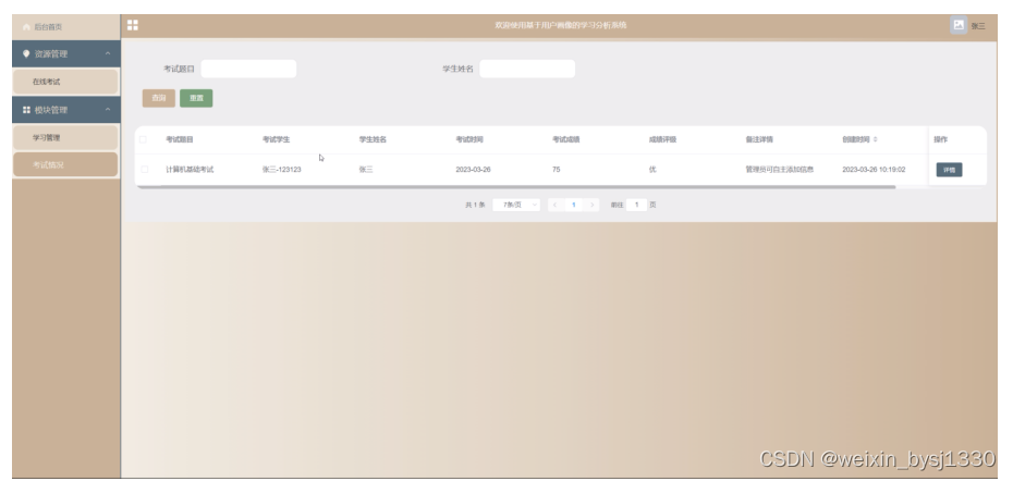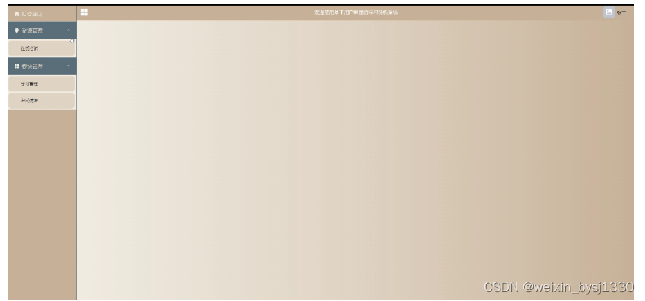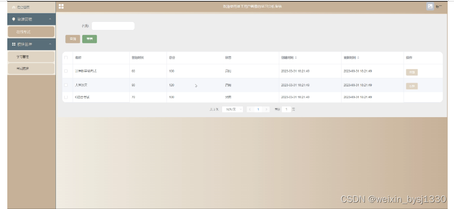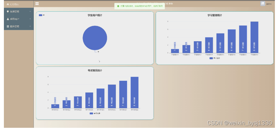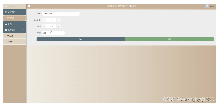 (1)功能要求:可以管理后台首页,资源管理(在线考试)模块管理(学习管理、考试情况)等功能模块。
