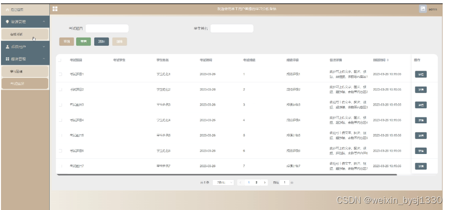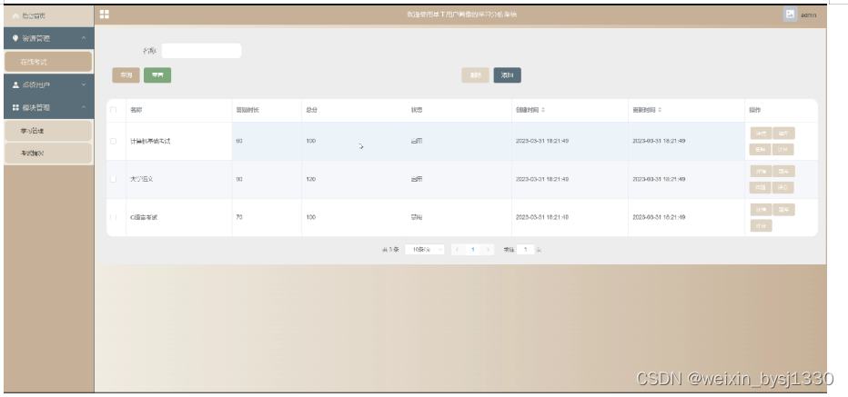 3、功能的完善性:可以管理后台首页,资源管理(在线考试)模块管理(学习管理、考试情况)等功能模块的修改维护操作。
