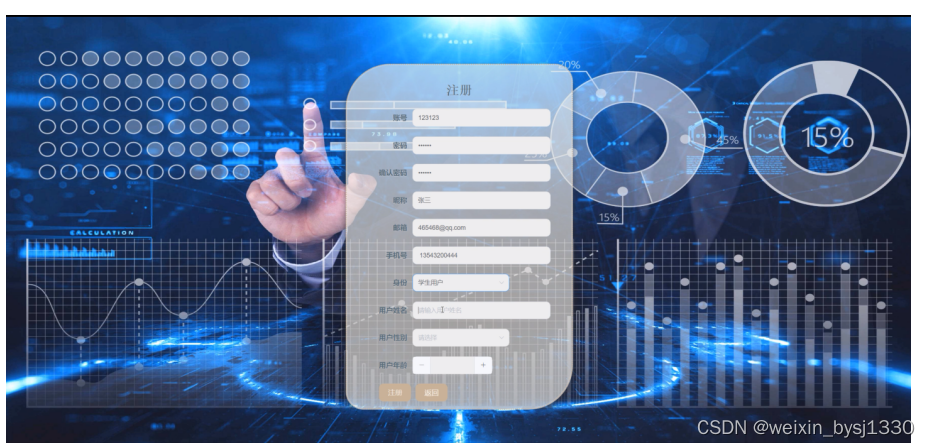 用户注册,通过填写账号、密码、昵称、邮箱、用户姓名、用户性别等信息,输入完成后选择登录即可进入基于用户画像的学习分析系统,如图5-10 5-11所示。