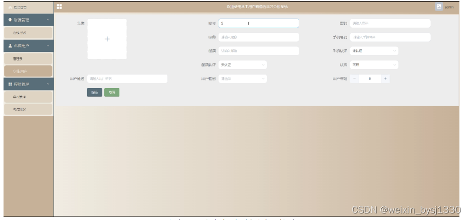 管理员登录进入首页后,可以编辑操作资源管理(在线考试)模块管理(学习管理、考试情况)系统用户(管理员、学生用户)等内容,如图5-2所示。