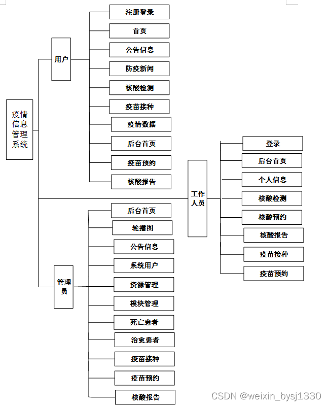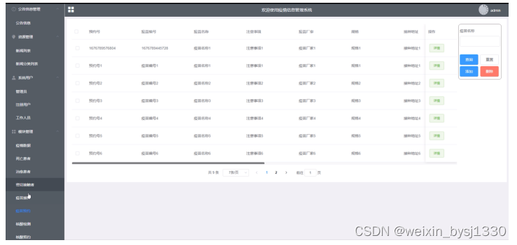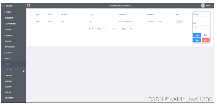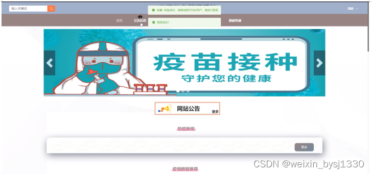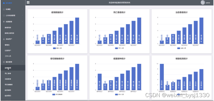 3、功能的完善性:可以管理后台首页、轮播图管理、公告信息管理、系统用户(管理员、注册用户、工作人员)资源管理(新闻列表、新闻分类列表)、模块管理(疫情数据、疫情接种、核酸检测、核酸预约、核酸报告、疫苗预约、死亡患者、治愈患者、密切接触者)个人信息等功能的修改和维护操作。