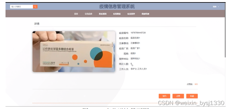 疫苗接种:用户在此页面可通过搜索查看疫苗的所示信息,点击需要的接种的疫苗可查看详细信息,如:疫苗编号、疫苗名称、注册事项、疫苗厂家、规格、接种地址、统计人数、工作人员等详细信息,可进行点赞、收藏或在线预约,如图5-11 5-12所示。