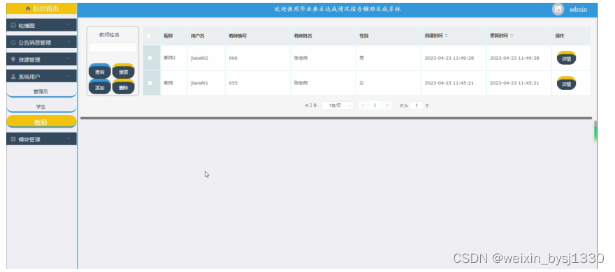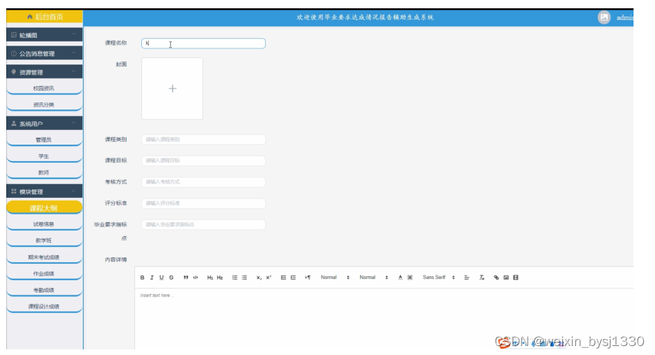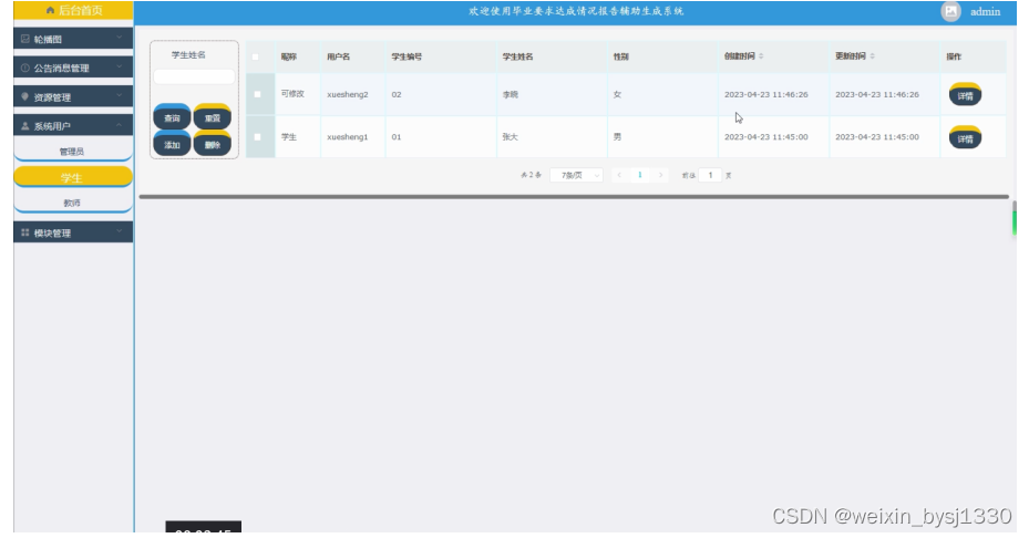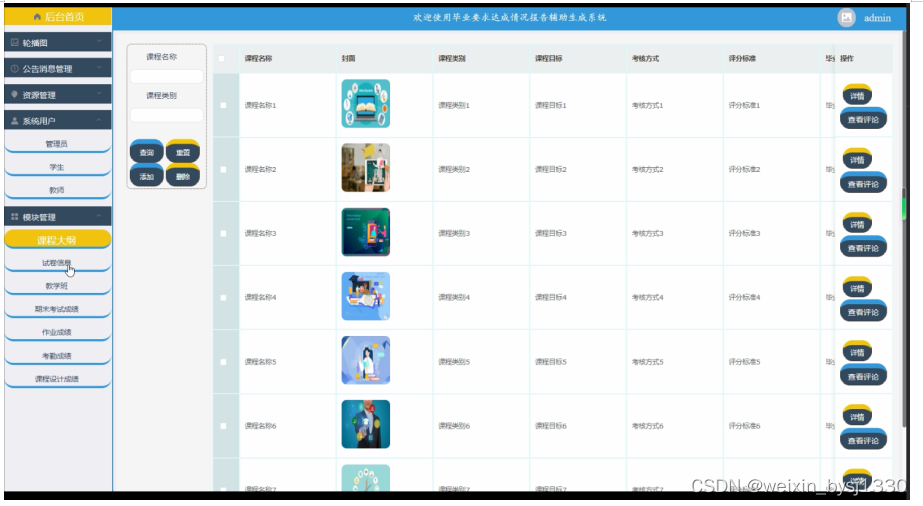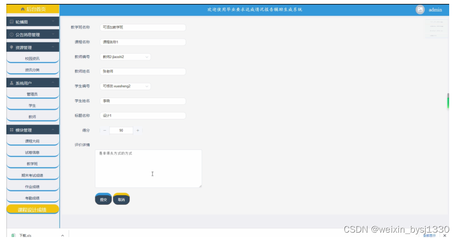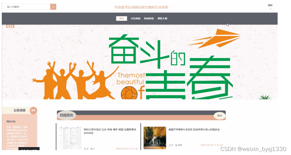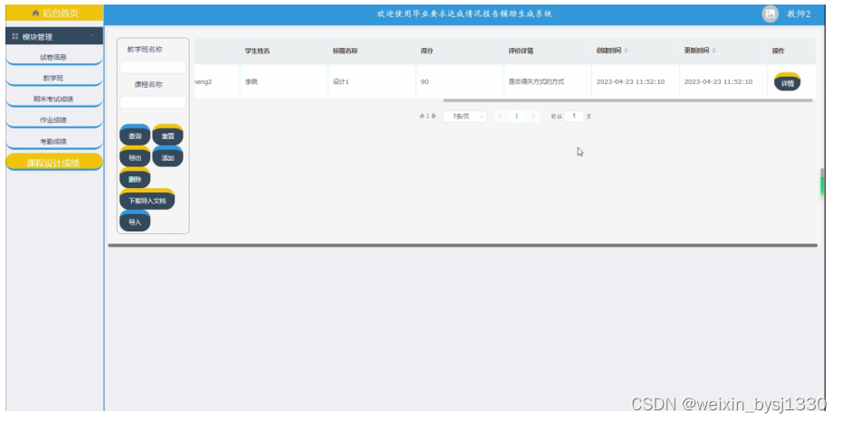 This design mainly implements a graduation requirement achievement report auxiliary generation system that combines the advantages of humanization, efficiency, and convenience, completing the homepage, broadcast images, announcement messages Resource management (campus information, information classification) system user (administrator, student, teacher) module management (curriculum outline, test paper information, teaching class, final exam scores, homework scores, attendance scores, course design scores) and other functional modules. The system communicates with the server through a browser to achieve data interaction and changes. You only need to use a computer and move your fingers to operate the system, achieving data communication management. The entire system design process fully considers issues such as data security, stability, and reliability, and the operation process is simple. This system improves work efficiency and reduces errors and omissions in data storage through scientific management and convenient services.