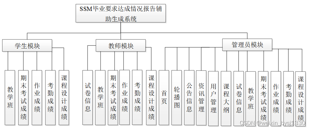 毕业要求达成情况报告辅助生成系统在对需求做解析后,整个系统主要分为两个部分:管理员和普通用户,每个模块下的分支功能不一样。对功能做出如下说明:
