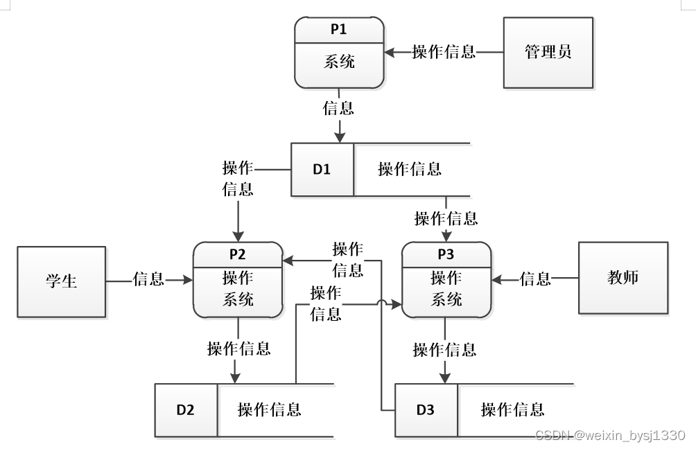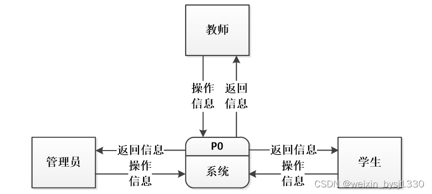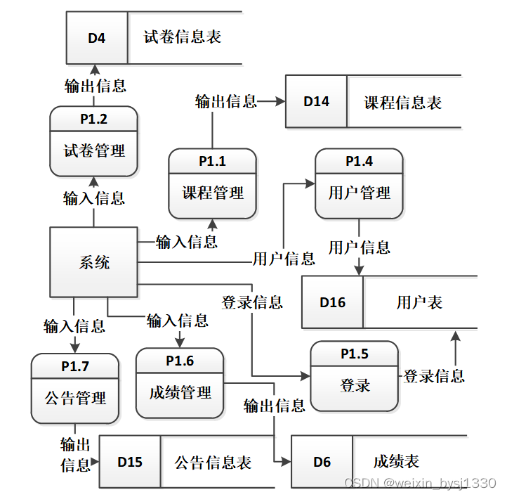 二层数据流程是对一层数据流层图中填写登录信息、用户功能的细化。即:填写登录信息细化为填制信息、后台审核,用户功能细化为学生成绩录入、课程查询、公告查询等操作。