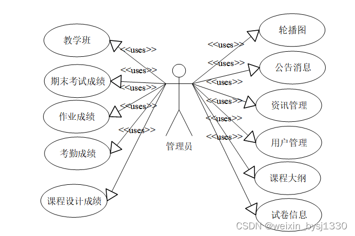 系统设计的目的是分析系统包括的所有功能结构,为开发人员设计开发和实现系统做好准备工作。经过前期的需求调查、分析和整理之后,确定的总体需求主要包括多个模块,分别是:首页、轮播图、公告消息、资源管理(校园资讯、资讯分类)系统用户(管理员、学生、教师)模块管理(课程大纲、试卷信息、教学班、期末考试成绩、作业成绩、考勤成绩、课程设计成绩)。系统整体角色分为三个部分,一是学生、二是教师、最后是管理员。权限分布也是很明显,普通用户是在除去浏览信息之外还具有查询和管理自己账户信息、教师资料修改、学生成绩录入、课程查询、公告查询、学生资料修改、成绩查询等权限;管理员是最高权限拥有者。