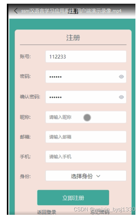 用户注册在登陆页面填写账号、密码、邮箱、手机昵称、姓名等信息,进行注册如图5.7所示