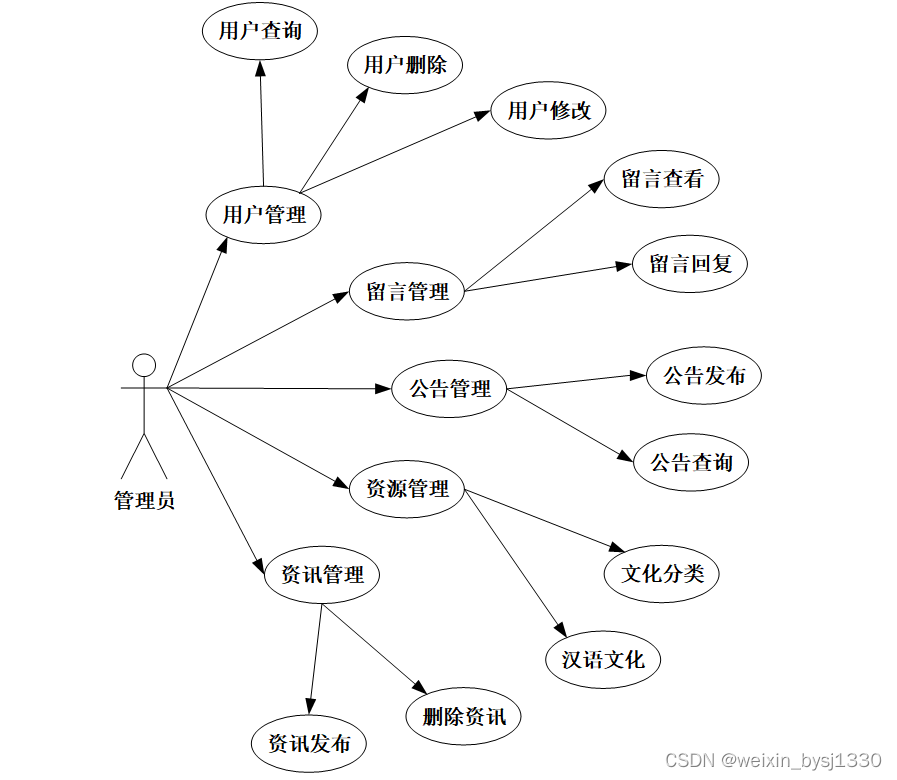 3.管理员主要负责首页、公告栏、交流管理(文化论坛、论坛分类)轮播图、资源管理(汉语文化、文化分类)系统用户(管理员、系统用户)模块管理(赏析留言),下图所示描述管理员的用例图。