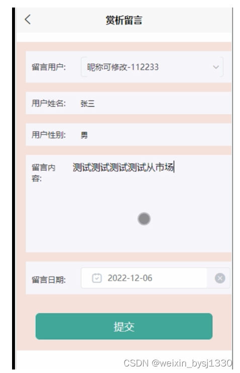 赏析留言页面可填写留言用户、用户姓名、用户性别、留言内容、留言日期等信息,如图5.11所示。