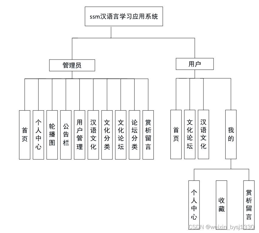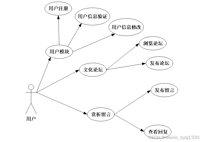 1.普通用户主要使用系统的汉语言学习应用系统APP操作首页、文化论坛、汉语文化、我的(个人中心、收藏、赏析留言),下图所示为普通用户的用例图。