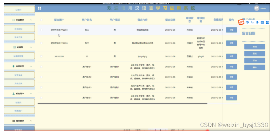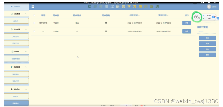 系统管理也都将通过计算机进行整体智能化操作,对于汉语言学习应用系统所牵扯的管理及数据保存都是非常多的,例如管理员;首页、公告栏、交流管理(文化论坛、论坛分类)轮播图、资源管理(汉语文化、文化分类)系统用户(管理员、系统用户)模块管理(赏析留言),用户;首页、文化论坛、汉语文化、我的(个人中心、收藏、赏析留言)等,这给管理者的工作带来了巨大的挑战,面对大量的信息,传统的管理系统,都是通过笔记的方式进行详细信息的统计,后来出现电脑,通过电脑输入软件将纸质的信息统计到电脑上,这种方式比较传统,而且想要统计数据信息比较麻烦,还受时间和空间的影响,所以为此开发了汉语言学习应用系统;为用户提供了方便管理平台,方便管理员查看及维护,并且可以通过需求进行内容的编辑及维护等;对于用户而言,可以随时进行查询所需信息,管理员可以足不出户就可以获取到系统的数据信息等,而且还能节省用户很多时间,所以开发汉语言学习应用系统给管理者带来了很大的方便,同时也方便管理员对用户信息进行处理。