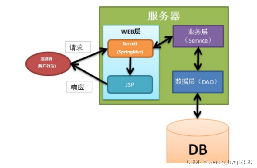 页面发送请求给控制器,控制器调用业务层处理逻辑,逻辑层向持久层发送请求,持久层与数据库交互,后将结果返回给业务层,业务层将处理逻辑发送给控制器,控制器再调用视图展现数据。