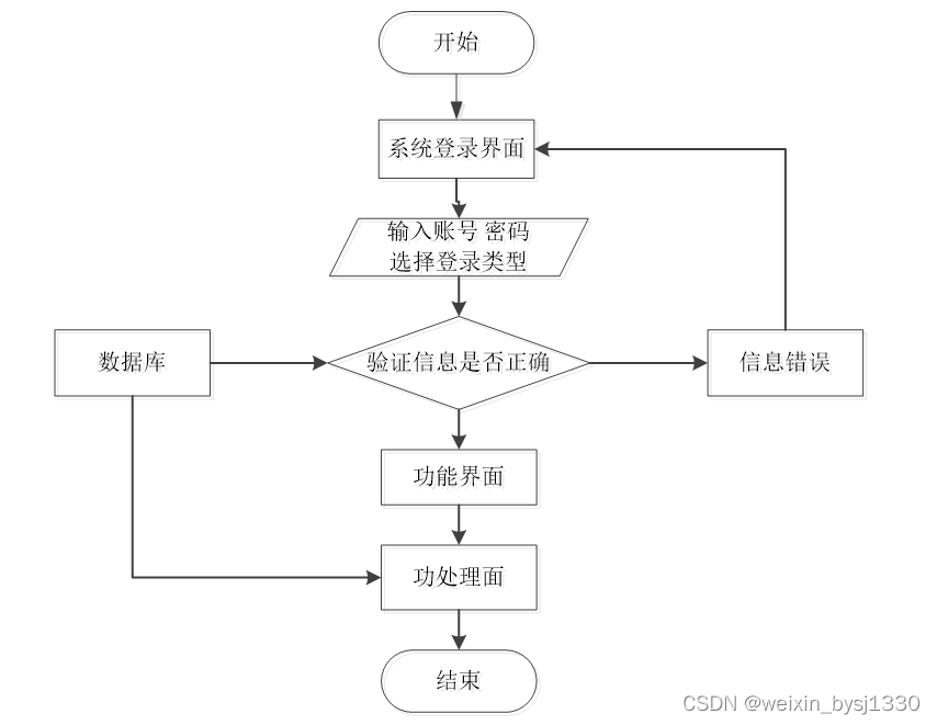 用户想进入系统,首先进入系统登录界面,通过正确的用户名、密码,选择登录类型登录,系统会检查登录信息,信息正确,然后输入相应的功能界面,提示信息错误,登录失败。系统操作流程如图3-4所示。