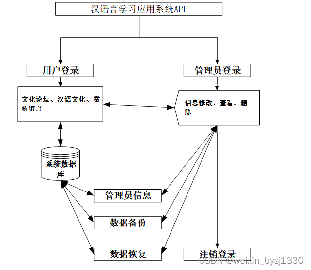 系统架构图属于系统设计阶段,系统架构图只是这个阶段一个产物,系统的总体架构决定了整个系统的模式,是系统的基础。基于汉语言学习应用系统的整体结构设计如图4-2所示。