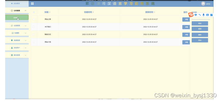 在当今高度发达的信息中,信息管理改革已成为一种更加广泛和全面的趋势。 “汉语言学习应用系统”是基于Mysql数据库,在SSM框架程序设计的基础上实现的。为确保中国经济的持续发展,信息时代日益更新,服务行业仍在蓬勃发展。同时,随着信息社会的快速发展,各种管理系统面临着越来越多的数据需要处理,如何用方便快捷的方式使管理者在广阔的数据海洋里面查询、存储、管理和共享有效的数据信息,对我们的学习,工作和生活具有重要的现实意义。因此,国内外学术界对此进行了深入而广泛的研究,一个新的研究领域——汉语言学习应用系统诞生了。