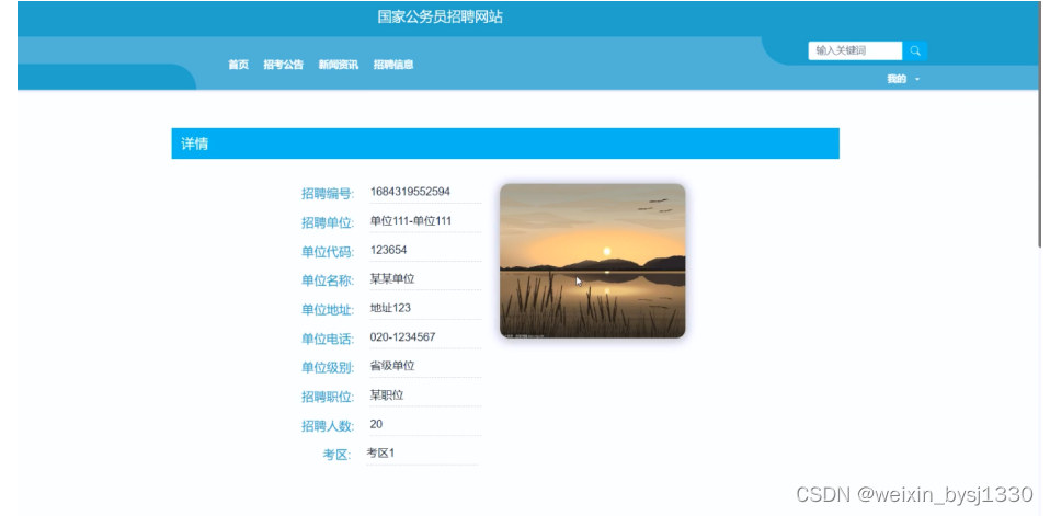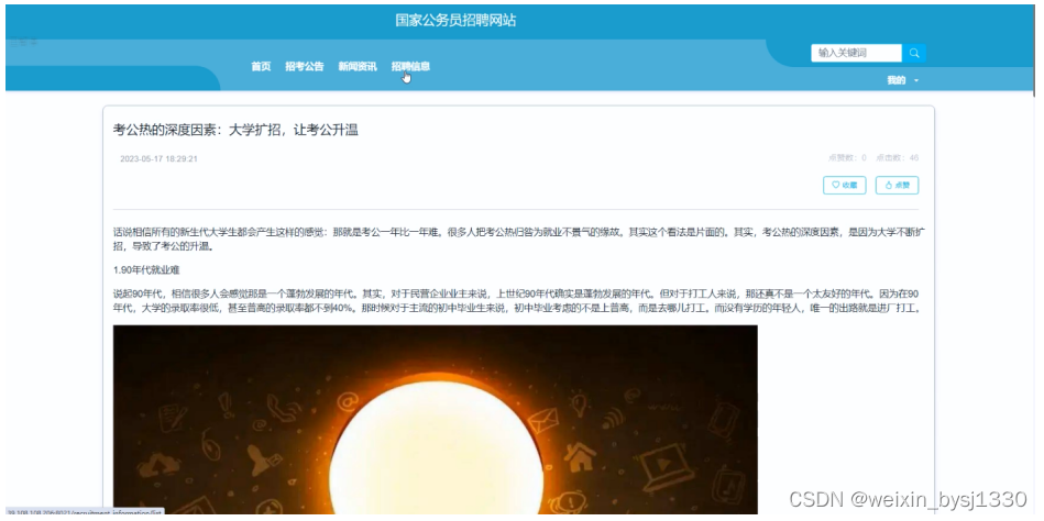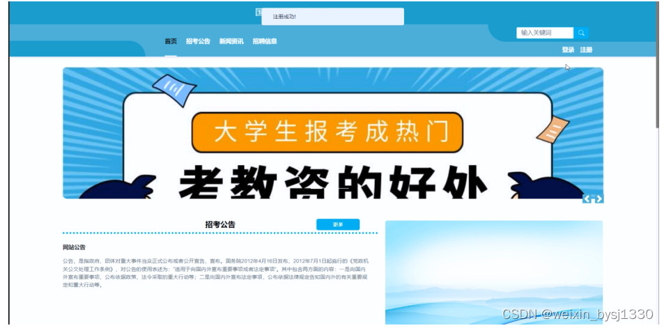 (2)招考公告:用户可以查看后台管理员发布的招考公告,在查询到自己想要了解的招考公告的时候,可以进入查看详细的介绍。