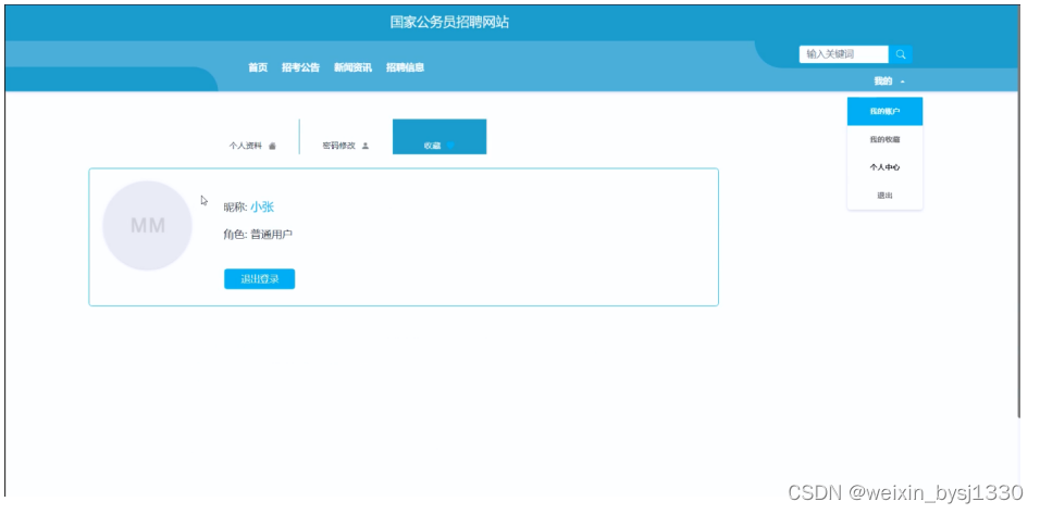 (4)我的账户:在前台点击“我的”下面的“我的账户”可以对个人资料+密码修改+自己收藏的信息进行管控。