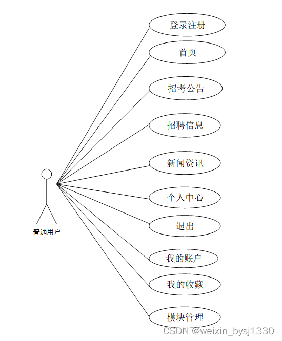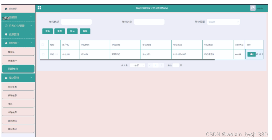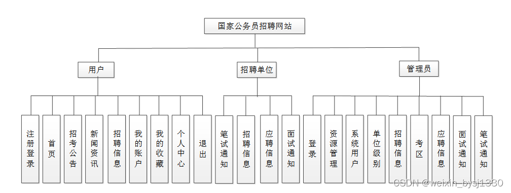 按照国家公务员招聘网站的角色,我划分为了管理员、普通用户以及招聘单位这三大部分。