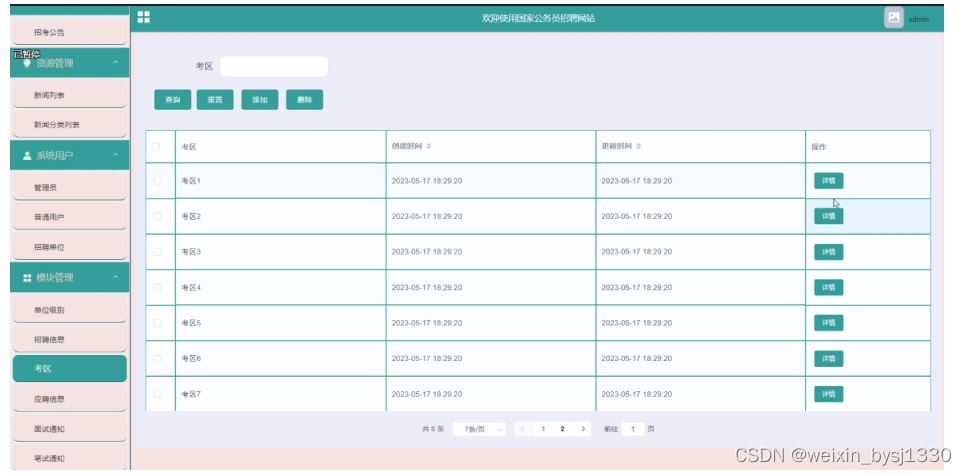 (3)招考公告:管理员点击“招考公告”菜单可以查看到系统中的所有招考公告信息,对已经存在的招考公告,管理员可以修改,也可以添加新的招考公告或者删除招考公告。