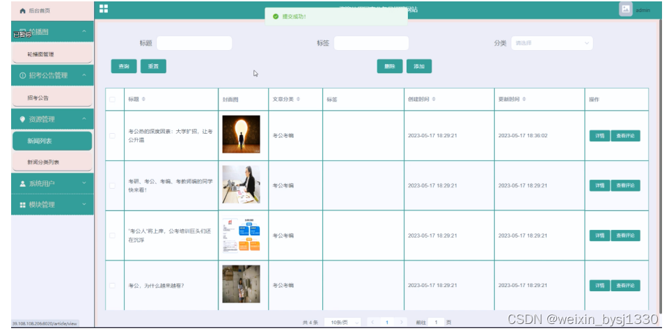 (4)资源管理:管理员点击“资源管理”菜单能够对其下子菜单新闻列表和新闻的分类进行增删改查。