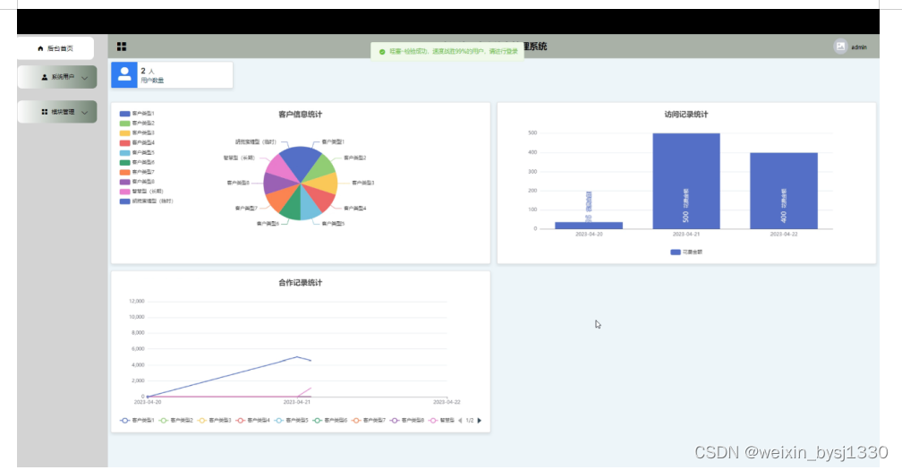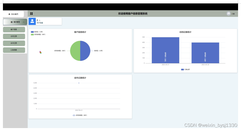 统计图,在后台界面可查看客户信息,访问记录,合作记录等统计图,如下图所示。