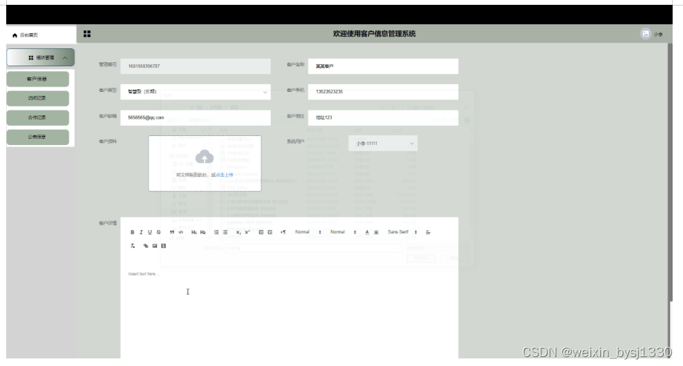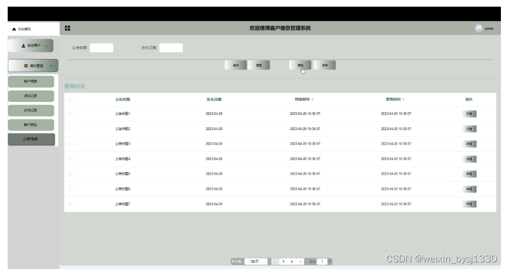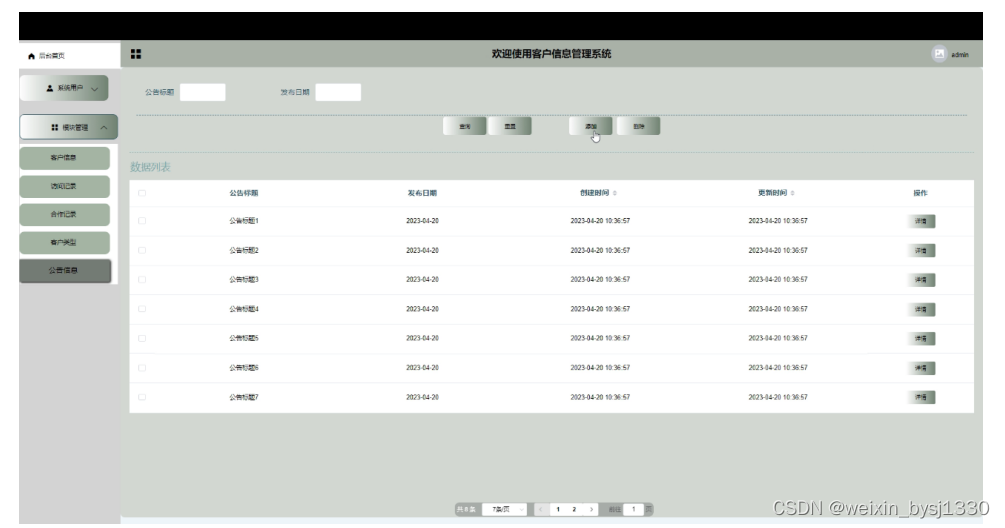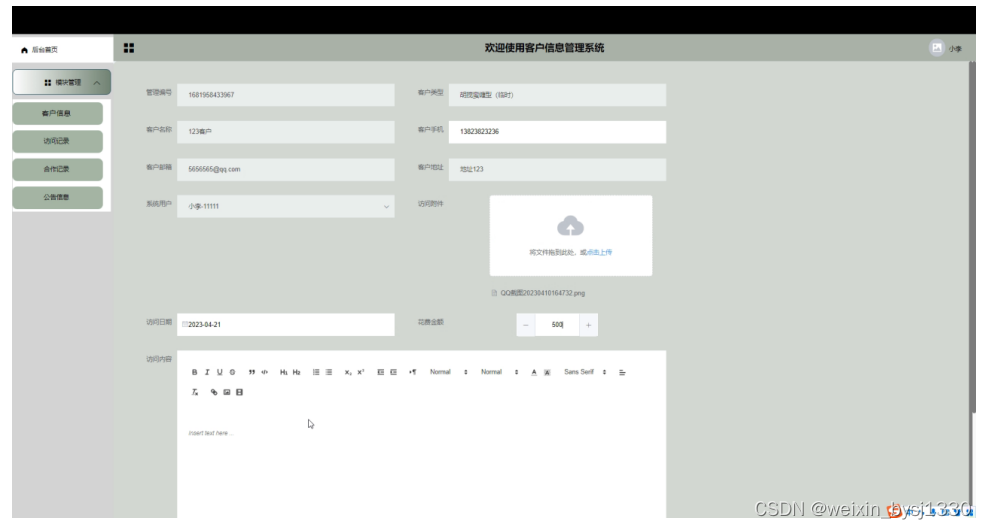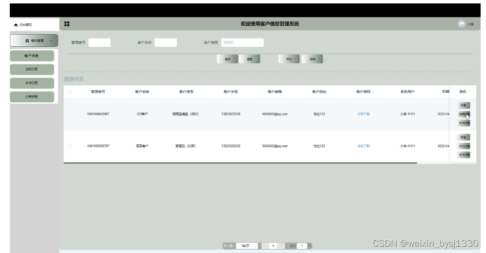 系统用户登录系统,可以查看后台首页,统计图,模块管理(客户信息,访问记录,合作记录,客户类型,公告信息)等信息,客户信息,如下图所示: