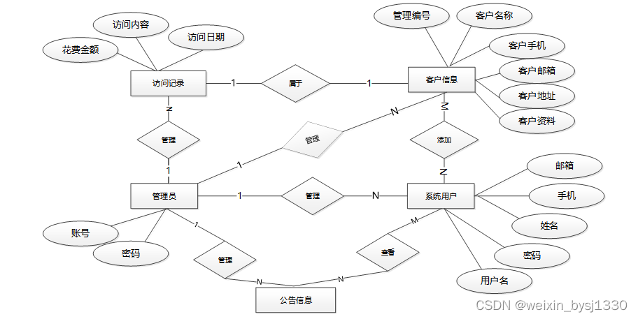 通过客户信息管理系统的功能进行规划分成几个实体信息,实体信息将通过ER图进行说明,本系统的主要实体图如下: