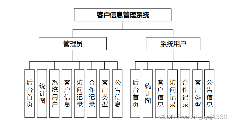 (1)功能要求:首页,统计图,系统用户(管理员,系统用户),模块管理(客户信息,访问记录,合作记录,客户类型,公告信息)等功能模块。