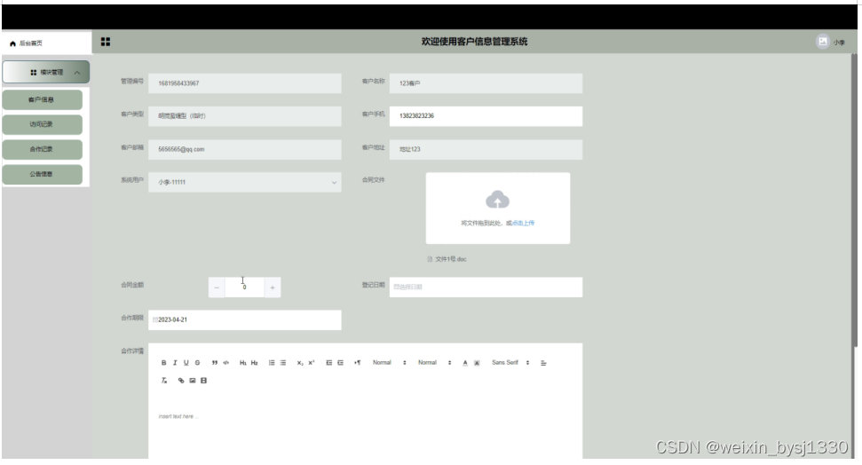 合作记录,系统用户在此页面可以管理维护合作记录,包括合作金额,登记日期,合作期限,合作详情,合同文件等信息,如下图所示。